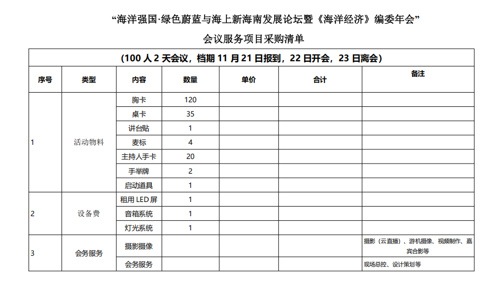 经研究,我校2025年“海洋强国·绿色蔚蓝与海上新海南发展论坛暨《海洋经济》编委年会”会议服务项目购置采取公开竞价的方式进行,竞价活动由旅游学院进行组织。具体竞价内容及要求如下: